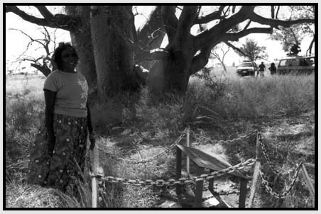 Peggy Patrick, Gija woman, stands next to the memorial sign.